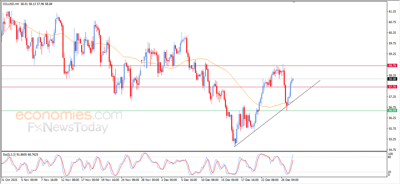 Prețul (țițeiului) și-a extins câștigurile în ultima tranzacționare intraday, depășind rezistența de 57,70 USD, care reprezintă ținta noastră așteptată, susținută de tranzacționarea sa de-a lungul liniei de trend corectiv bullish pe termen scurt, cu continuarea presiunii pozitive pe EMA50, pe lângă apariția semnalelor pozitive din partea indicatorilor de putere relativă.