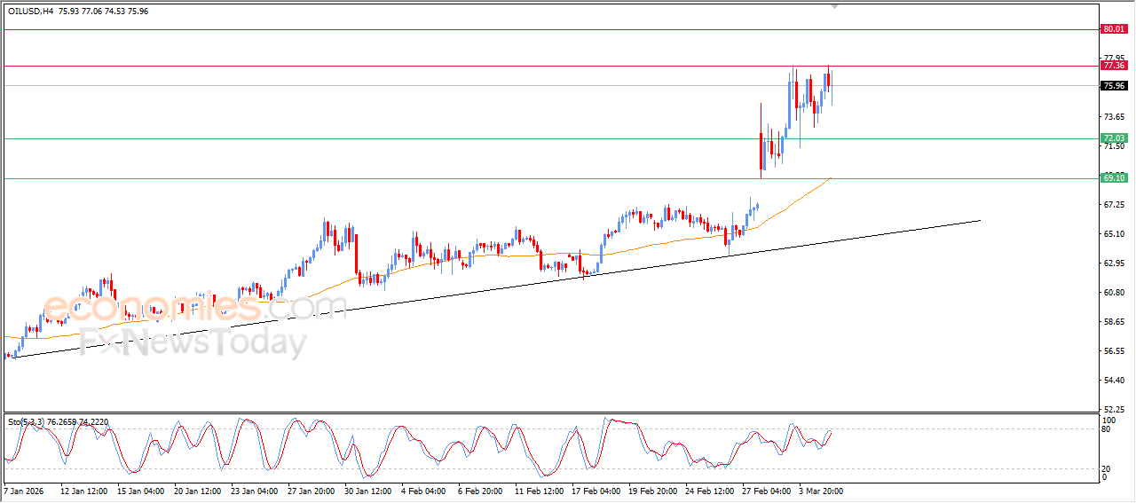 Prețul (țițeiului) a scăzut în ultima tranzacționare intraday, datorită stabilității rezistenței cheie la 77,35 USD, pentru a recupera câștigurile creșterilor anterioare, încercând să obțină un impuls ascendent care l-ar putea ajuta să depășească această rezistență, pe fondul continuării suportului dinamic reprezentat de tranzacționarea peste EMA50, consolidând dominanța trendului ascendent principal pe termen scurt, în special odată cu apariția semnalelor pozitive din partea indicatorilor de forță relativă.