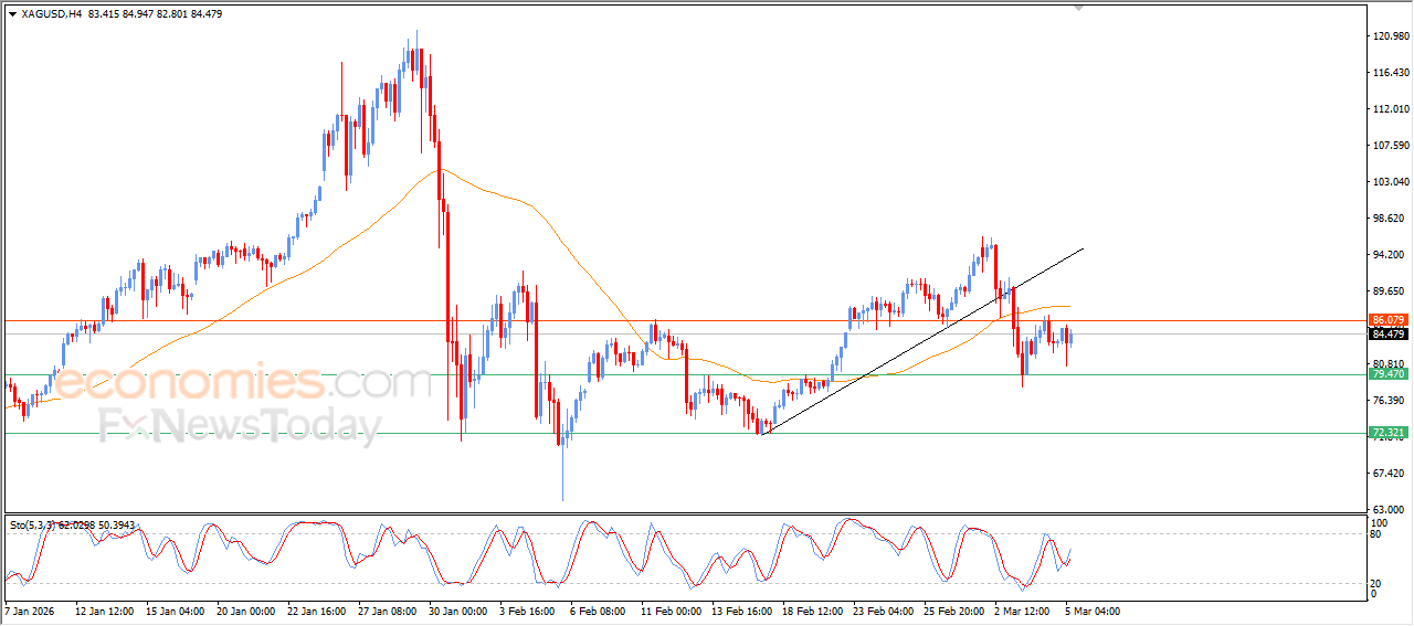 Prețul (argintului) se află în tranzacționare fluctuantă la ultimele niveluri intraday, afectat de apariția semnalelor pozitive din partea indicatorilor de forță relativă, cu continuarea presiunii negative datorate tranzacționării sub EMA50, ceea ce reprezintă o rezistență dinamică ce a redus șansele unei redresări complete pe termen scurt, fiind afectat de ruperea liniei de trend corectiv bullish pe termen scurt.