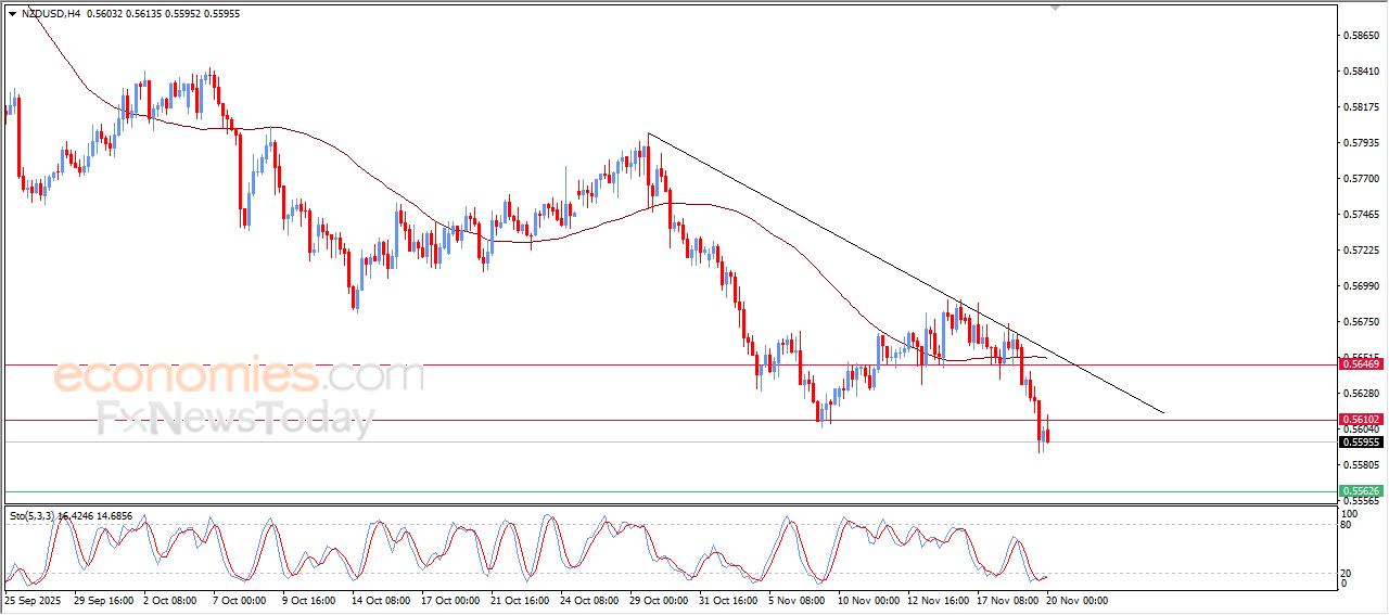 Prețul (NZDUSD) a scăzut în ultima tranzacționare intraday, după ce a depășit suportul cheie de la 0,5610, care reprezintă ținta așteptată în analiza anterioară, pe fondul continuării presiunii negative provenite din tranzacționarea sub EMA50 și sub dominația trendului principal bearish și a tranzacționării sale de-a lungul unei linii de trend minore pe termen scurt. Pe de altă parte, observăm apariția semnalelor pozitive asupra indicatorilor de putere relativă, după atingerea nivelurilor de supravânzare, ceea ce ar putea reduce pierderile viitoare.